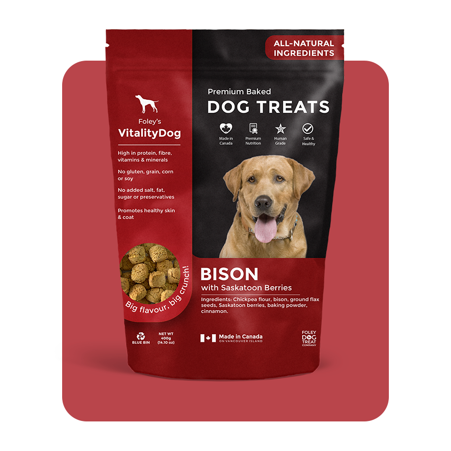 Ingredients: Chickpea Flour, Bison, Ground Flax Seeds, Saskatoon Berries, Baking Powder, Cinnamon.