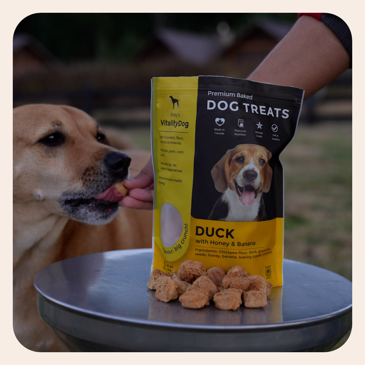 Ingredients: Chickpea Flour, Duck, Ground Flax Seeds, Honey, Banana, Baking Powder, Cinnamon.