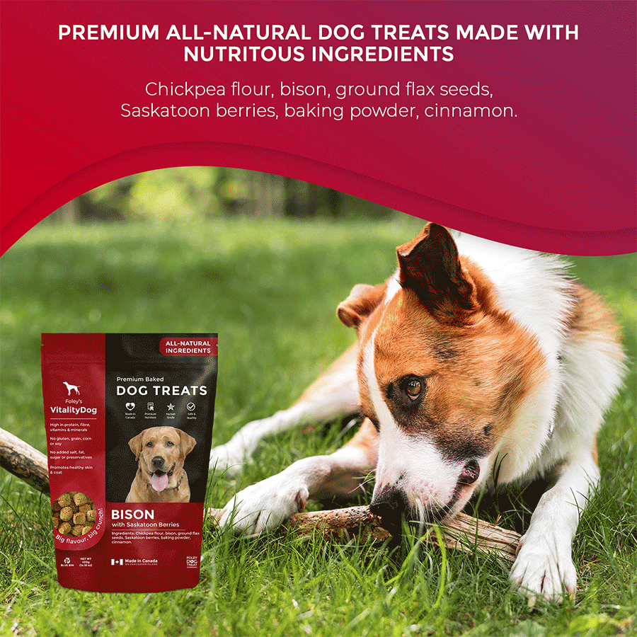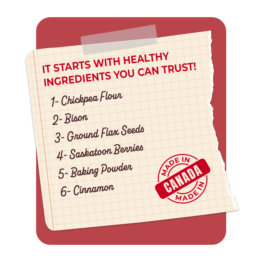 Ingredients: Chickpea Flour, Bison, Ground Flax Seeds, Saskatoon Berries, Baking Powder, Cinnamon.