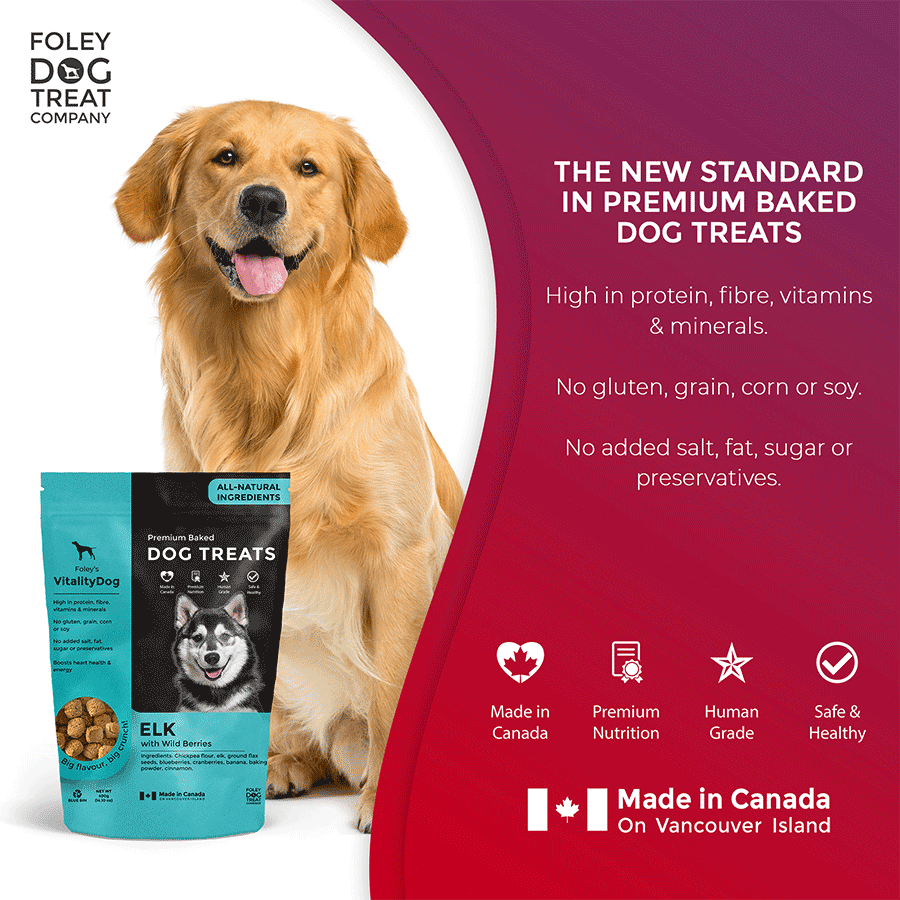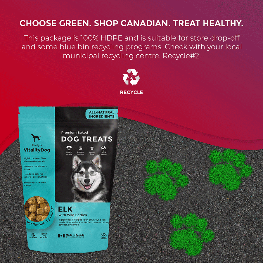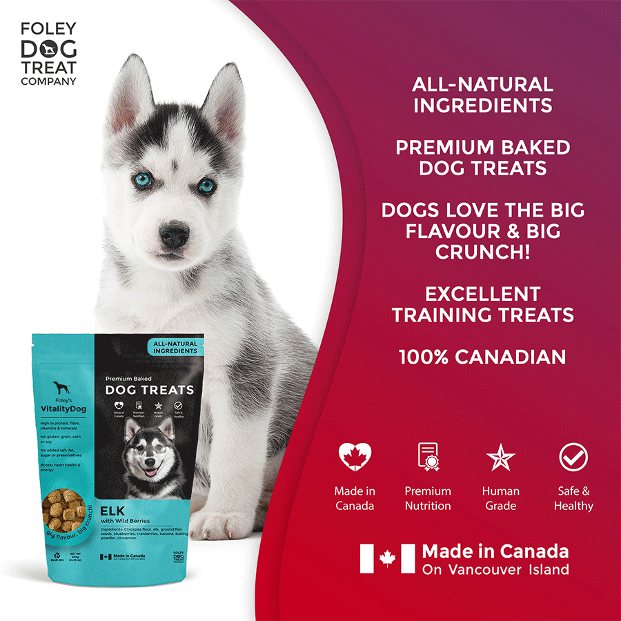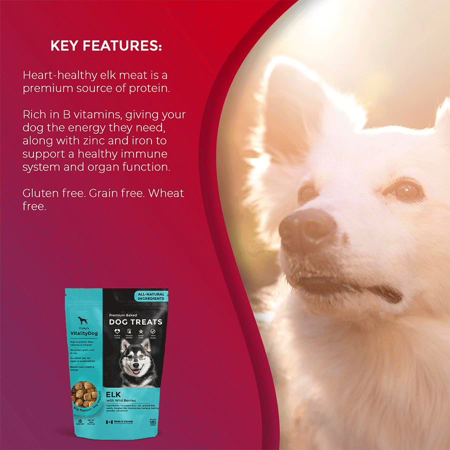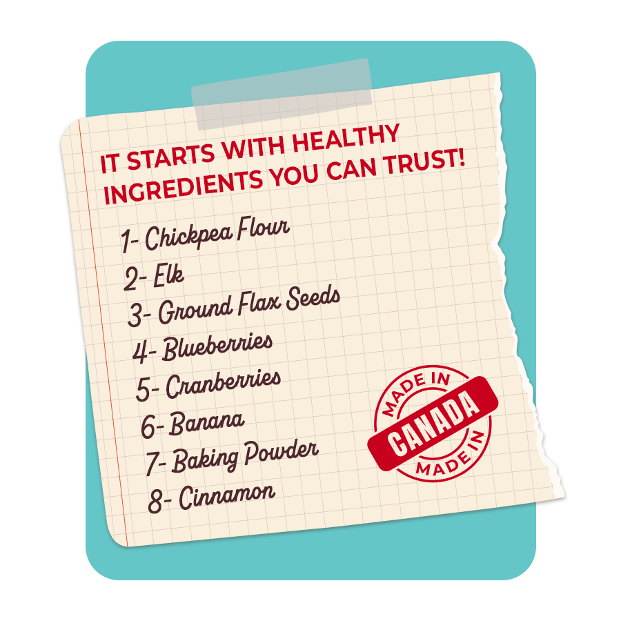 All Natural Ingredients: Chickpea Flour, Elk, Ground Flax Seeds, Blueberries, Cranberries, Banana, Baking Powder, Cinnamon.
