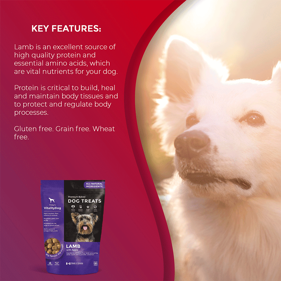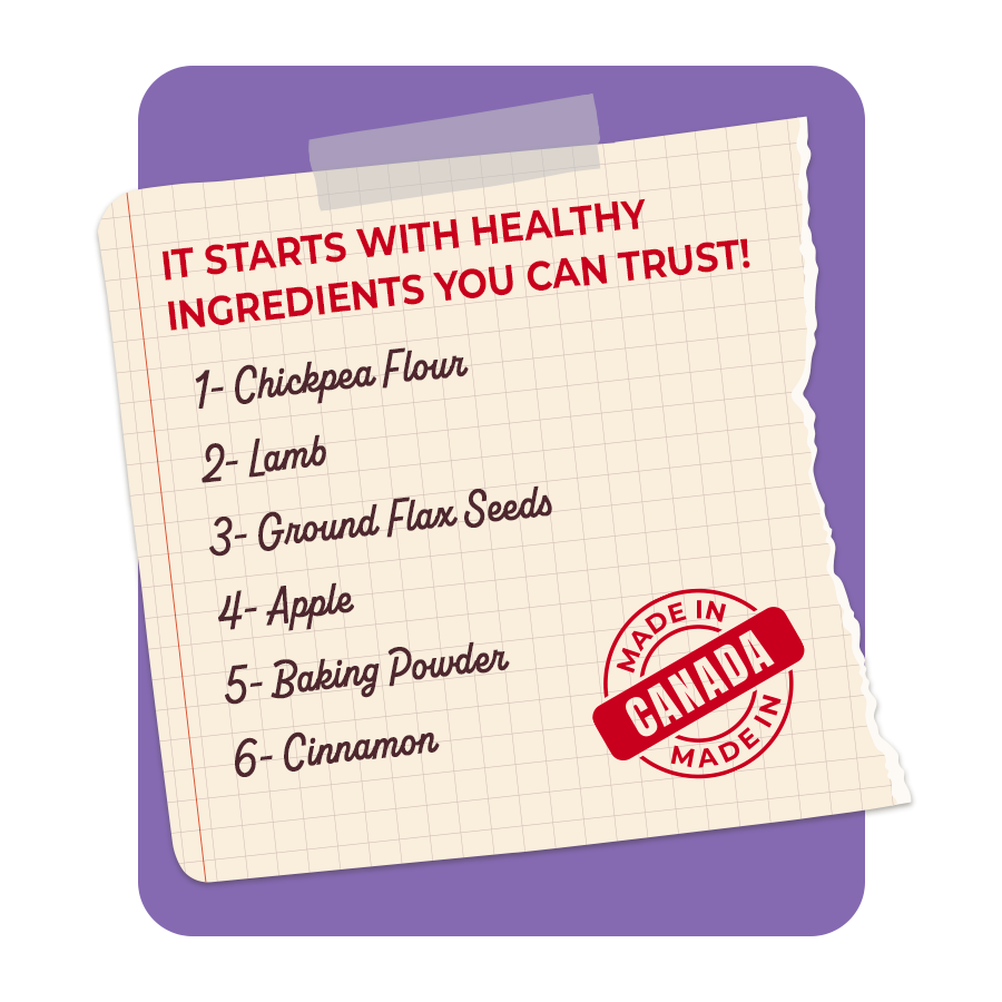 Ingredients: Chickpea Flour, Lamb, Ground Flax Seeds, Apple, Baking Powder, Cinnamon.