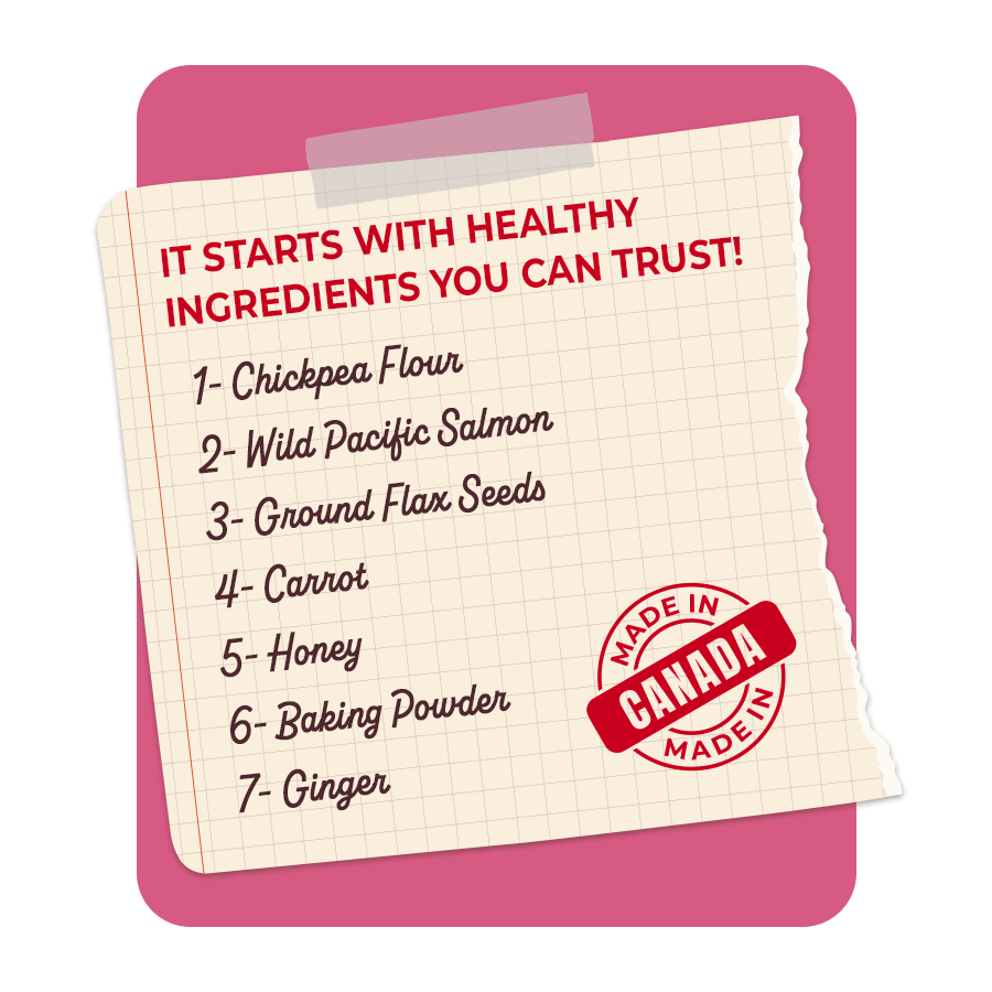 All Natural Ingredients: Chickpea Flour, Wild Pacific Salmon, Ground Flax Seeds, Carrot, Honey, Baking Powder, Ginger.