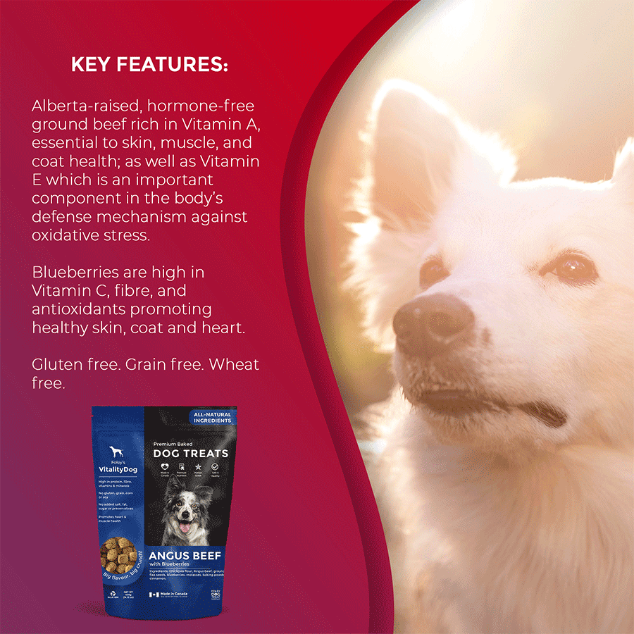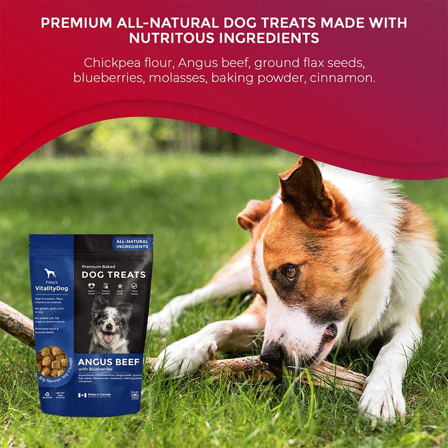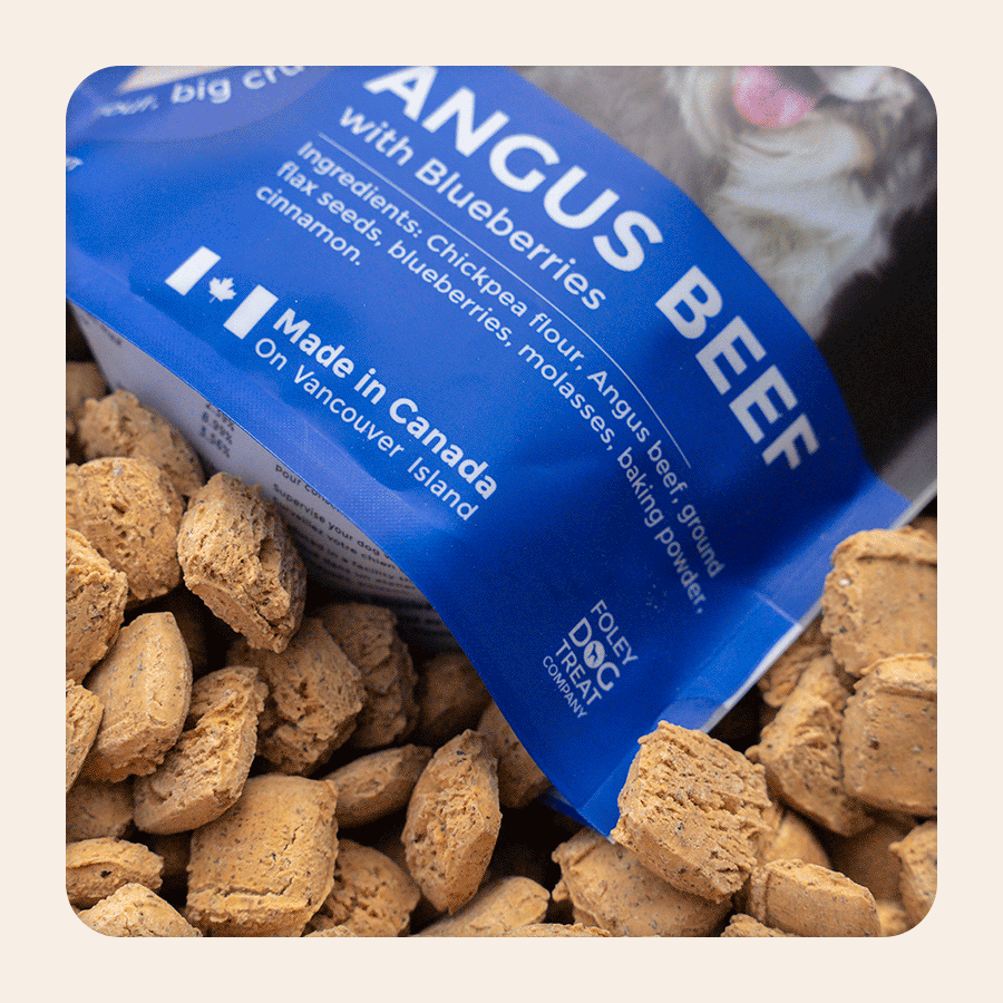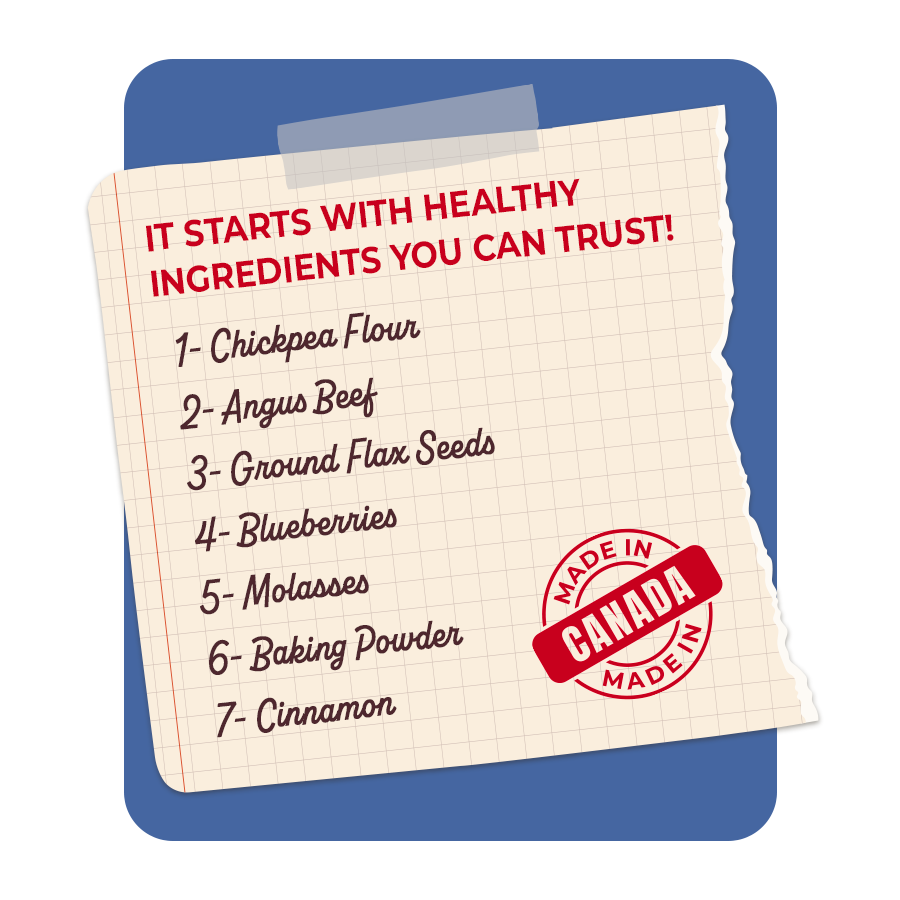 Ingredients: Chickpea Flour, Angus Beef, Ground Flax Seeds, Blueberries, Molasses, Baking Powder, Cinnamon.