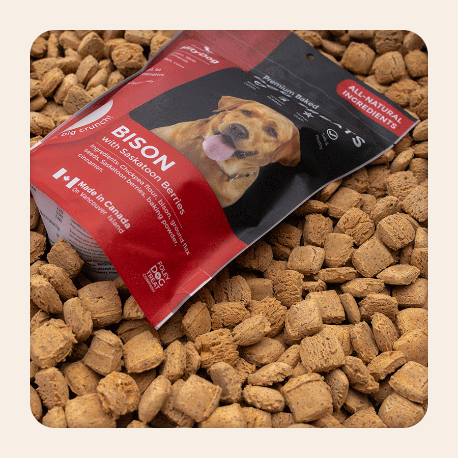 All Natural Ingredients: Chickpea Flour, Bison, Ground Flax Seeds, Saskatoon Berries, Baking Powder, Cinnamon.