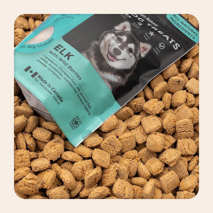 Ingredients: Chickpea Flour, Elk, Ground Flax Seeds, Blueberries, Cranberries, Banana, Baking Powder, Cinnamon.